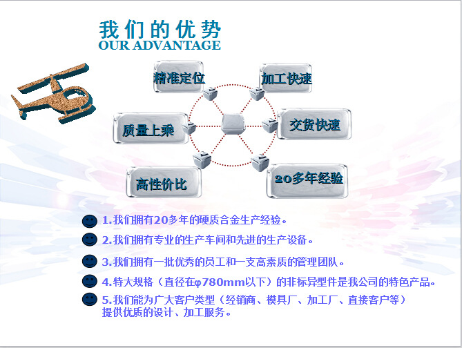 鋒冠硬質合金專注硬質合金領域逾二十年,專業生產和高精度加工各類硬質合金鎢鋼制品、耐磨件、各種非標異型硬質合金毛坯,各種行業的拉伸、整形、冷鐓、冷擠熱鍛模具等,以及磁性行業的無磁硬質合金。特大規格(直徑在φ820mm以下)的圓環產品和非標異型件的生產技術在國內處于領先地位,各類硬質合金產品暢銷全國各地及遠銷歐、美、新加坡等其他海外地區。